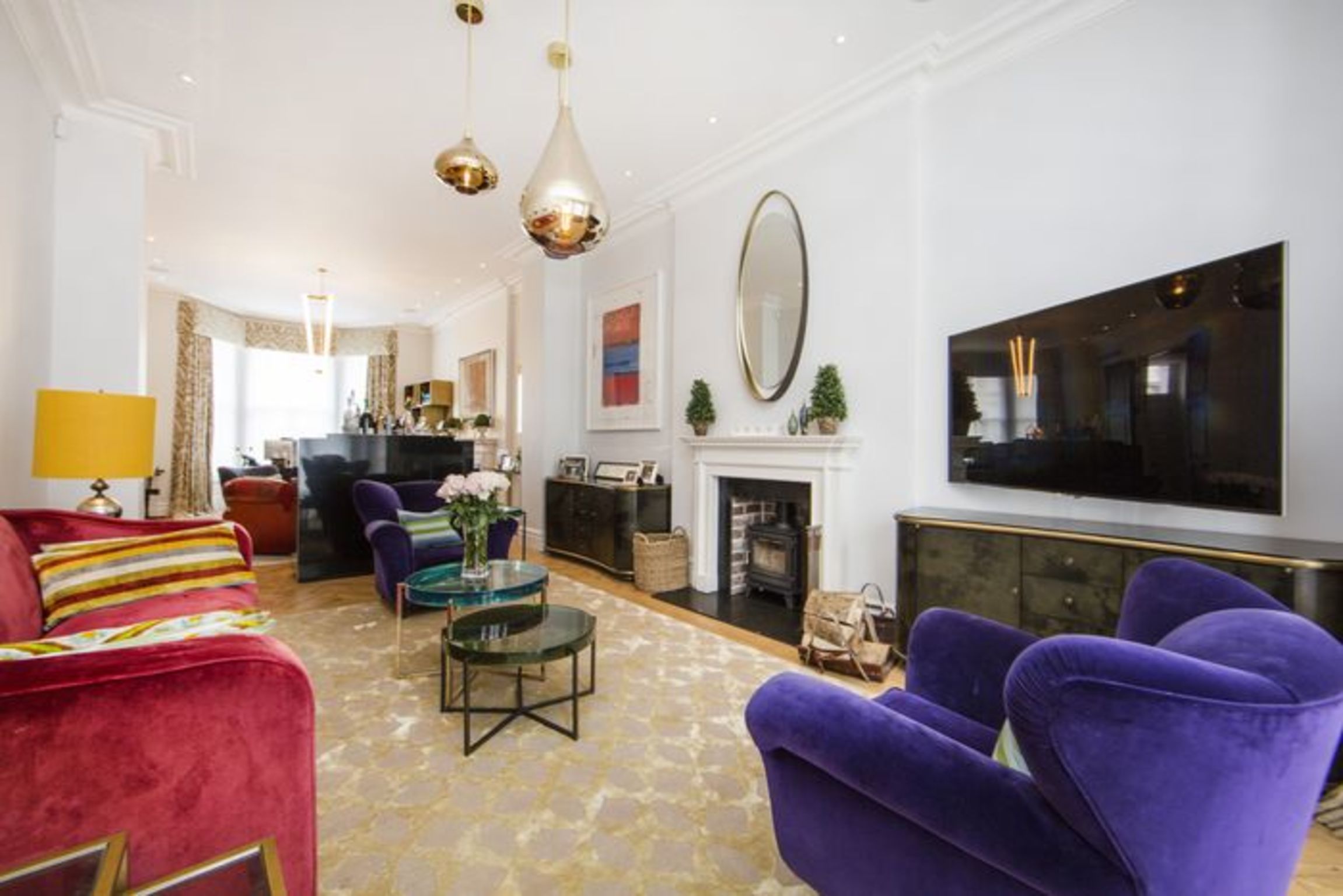The raised ground floor sprawling entrance leads directly into the stunning reception room, with comfortable sofa & armchairs opposite the working log fireplace, glass coffee table, and a large LCD TV.