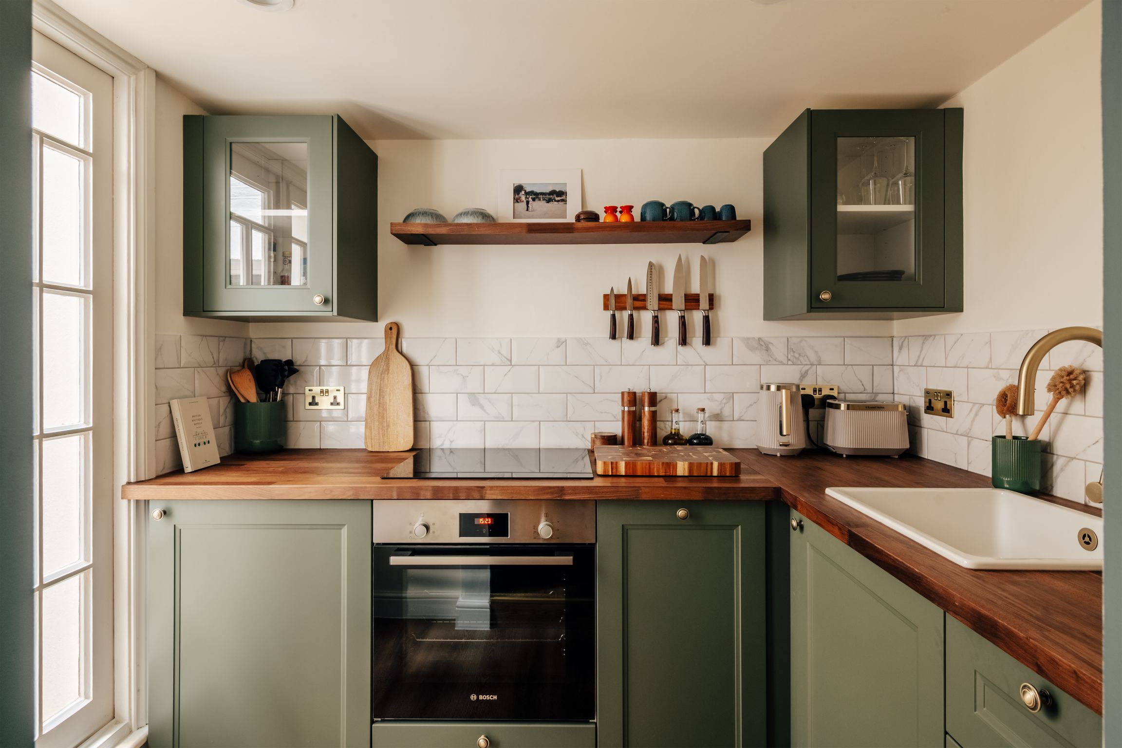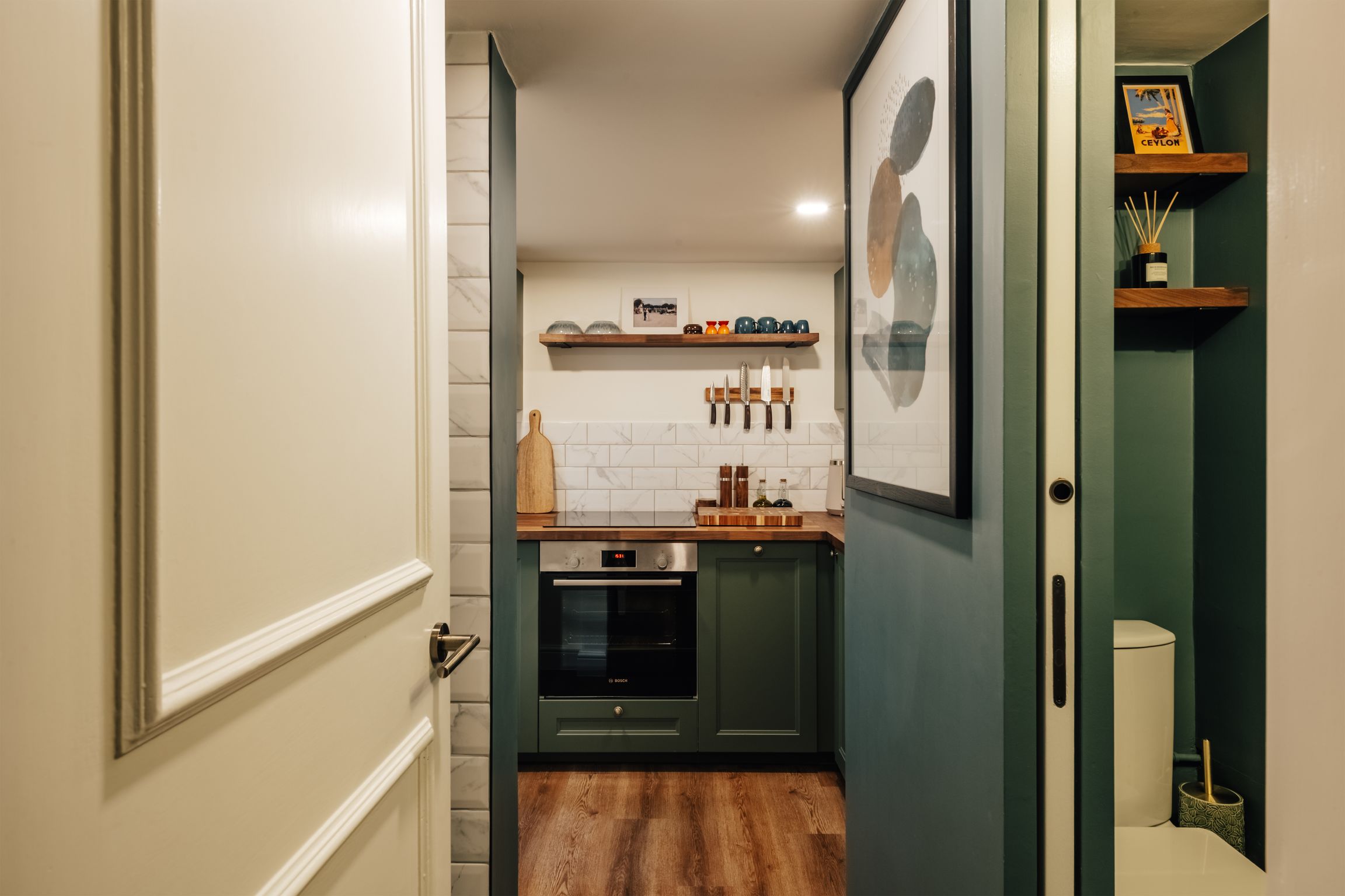 The stunning kitchen is fully loaded with all the essentials to make you feel at home. You’ll love the high-end espresso machine, plus complimentary coffee, water, and chocolates to get you started. The studio apartment has a similar kitchen set up with modern conveniences.