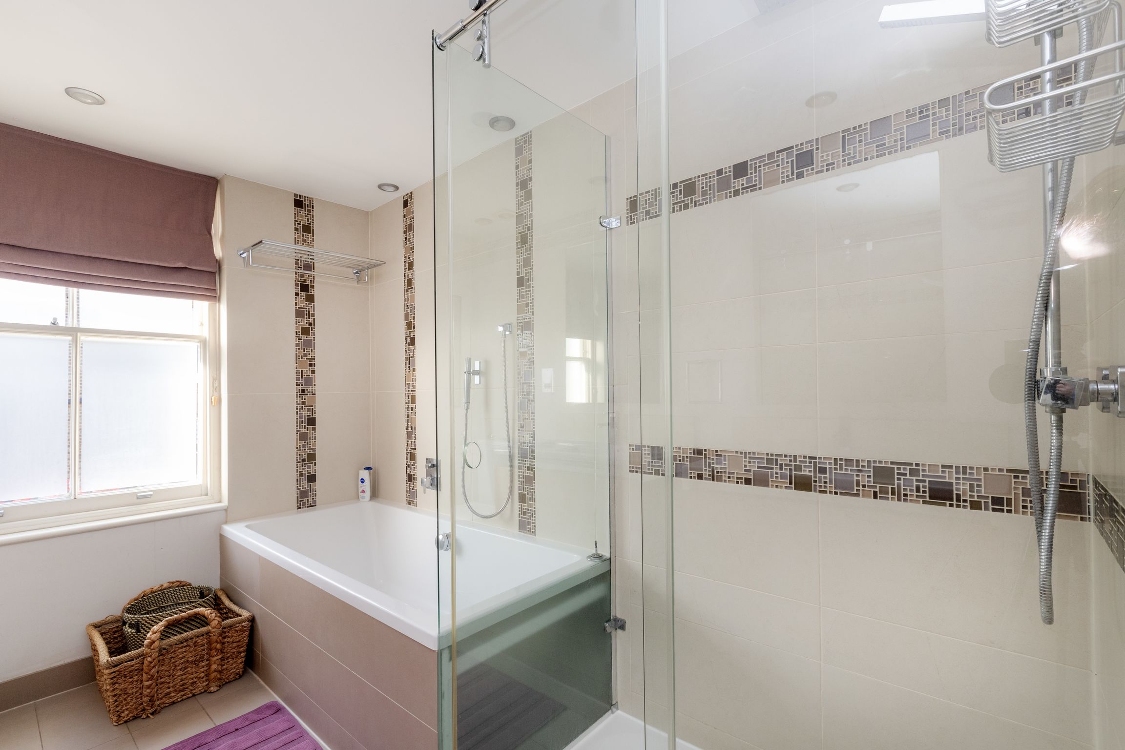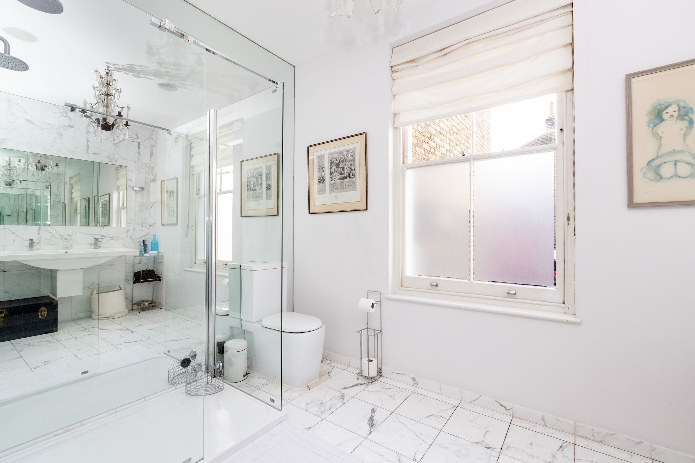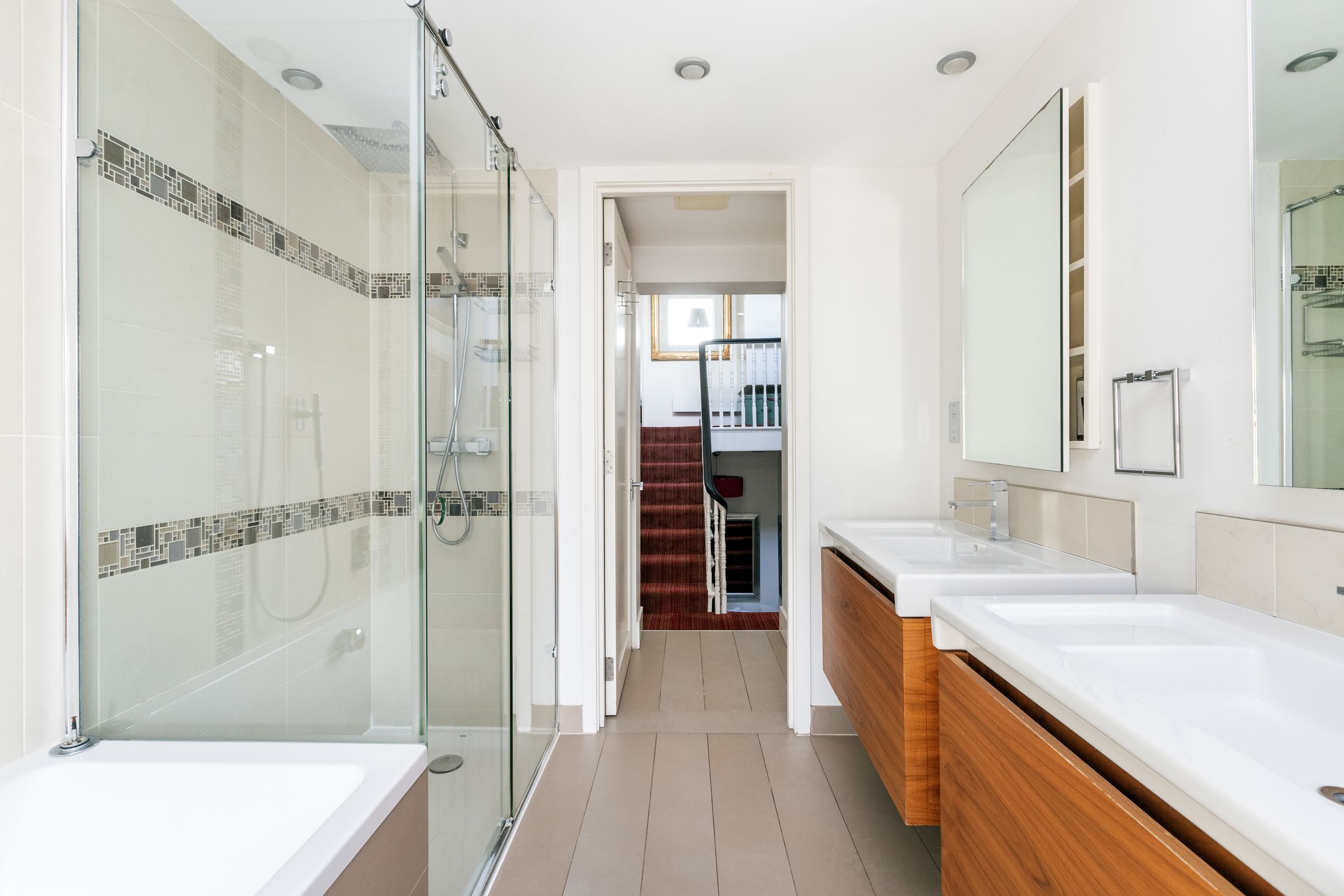 On the first and second floors, you’ll find 4 bedrooms which are all modern and neutrally decorated. The master bedroom has a super king-sized bed, fitted wardrobes, a chest of drawers, and a wall-mounted flat-screen TV. The marble en-suite has a large walk-in shower, double sink, and toilet. Bedroom two is fitted with a double bed, a desk and chair, and drawers. The third bedroom features a king-sized bed, wardrobe, and drawers. The fourth bedroom is also fitted with a king-sized bed.