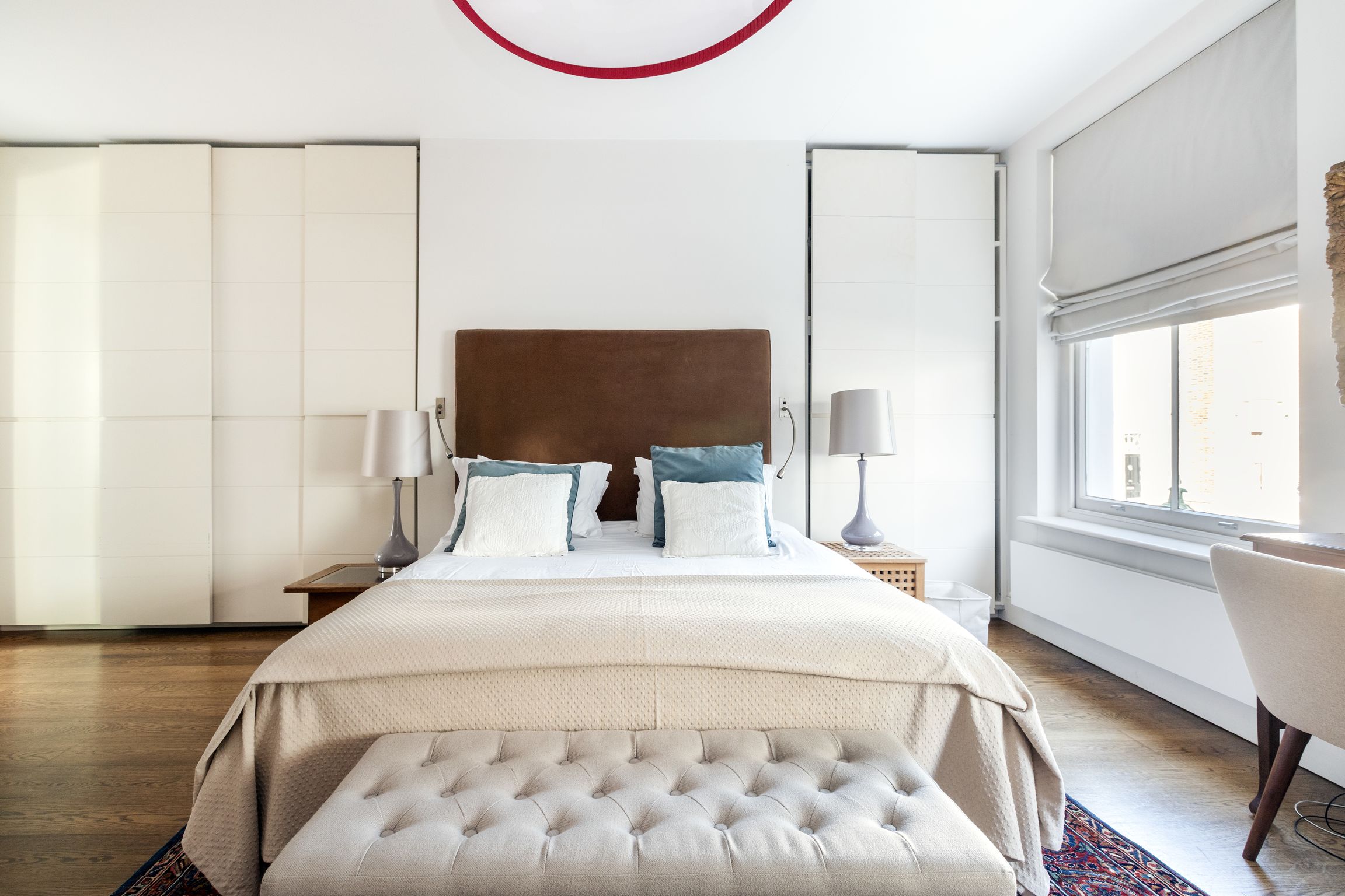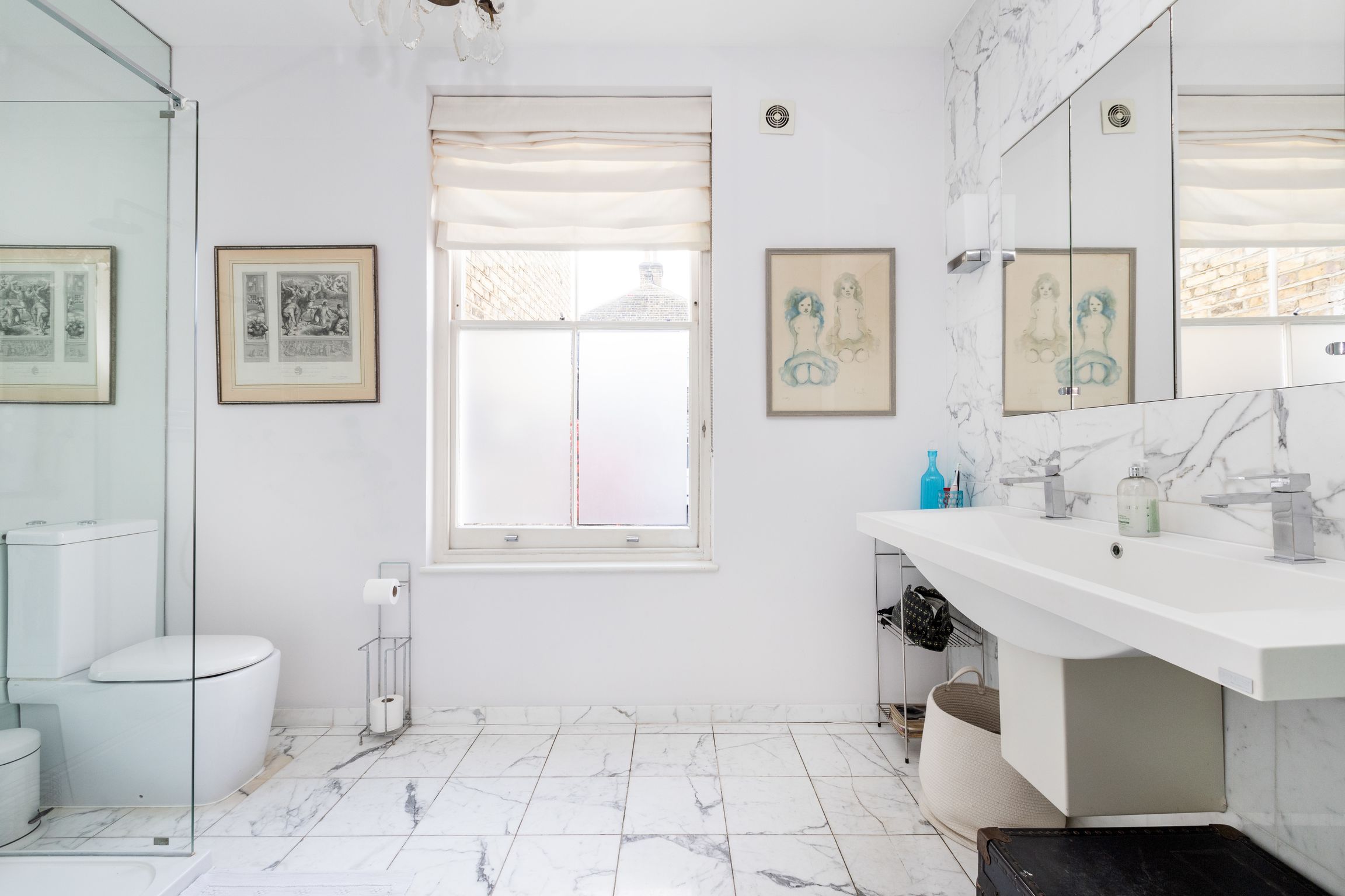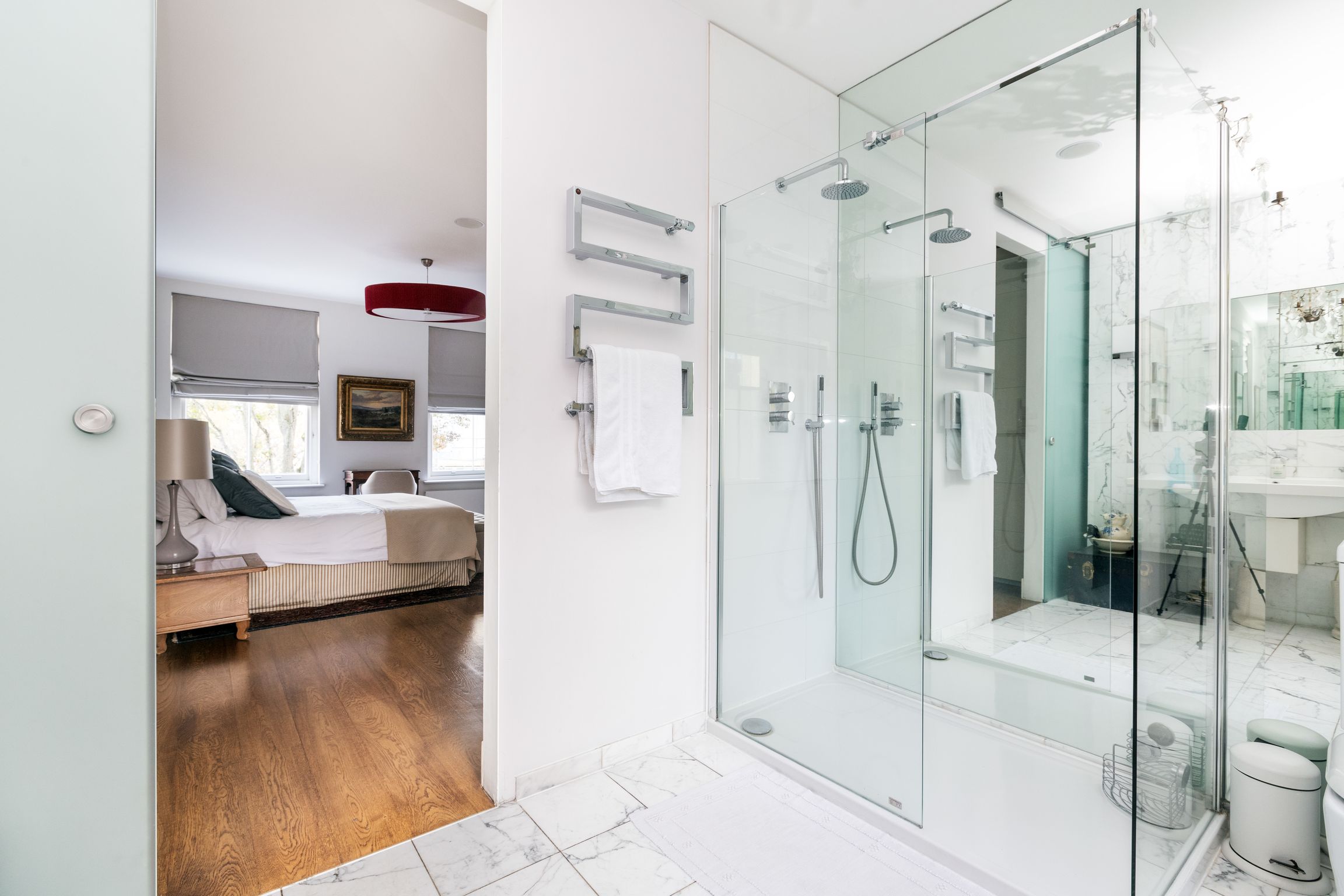 On the first and second floors, you’ll find 4 bedrooms which are all modern and neutrally decorated. The master bedroom has a super king-sized bed, fitted wardrobes, a chest of drawers, and a wall-mounted flat-screen TV. The marble en-suite has a large walk-in shower, double sink, and toilet. Bedroom two is fitted with a double bed, a desk and chair, and drawers. The third bedroom features a king-sized bed, wardrobe, and drawers. The fourth bedroom is also fitted with a king-sized bed.