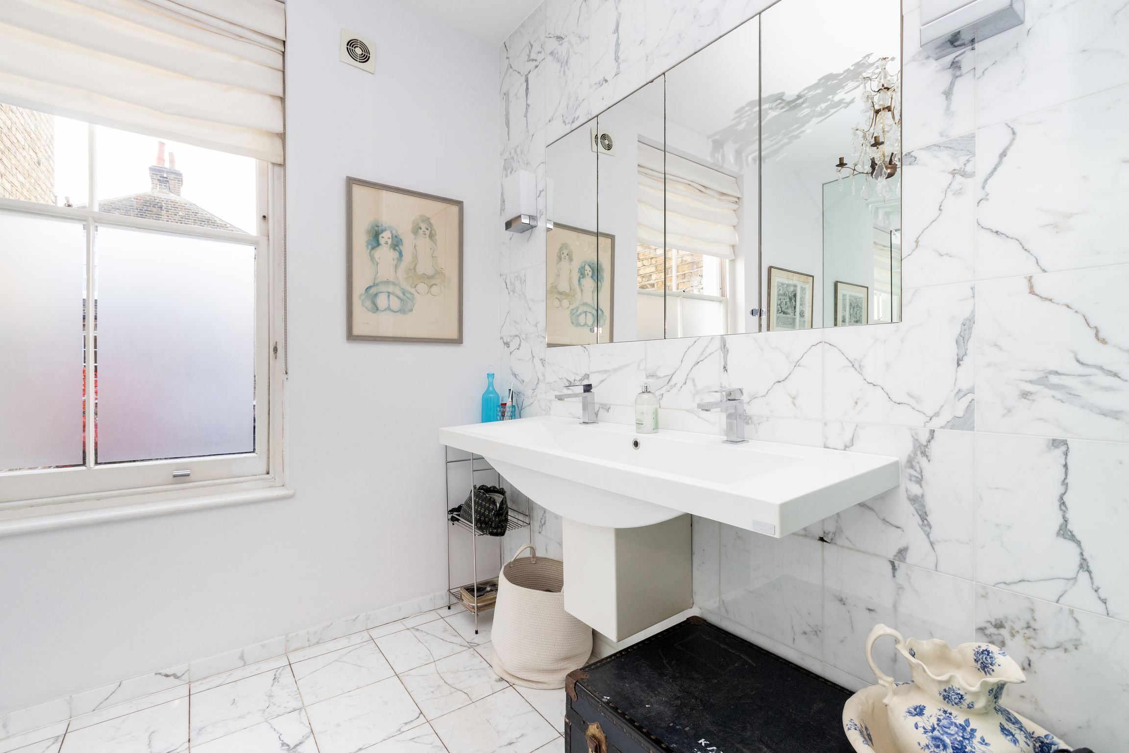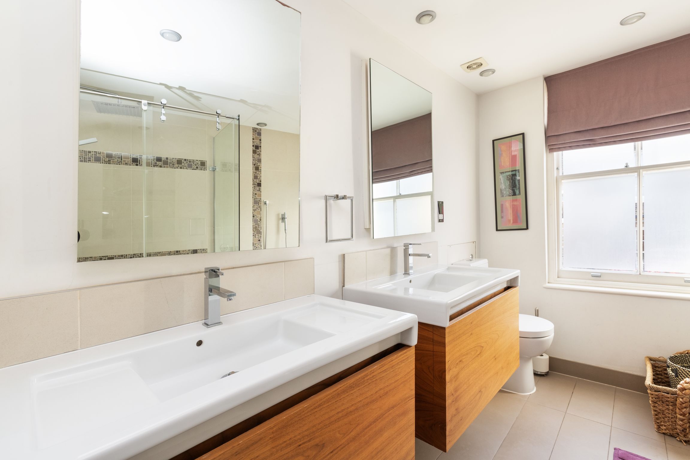 The sleek family bathroom is spacious with a tub, hand-held or wall-attached shower unit, shower cubicle, twin wash basins side by side, a loo, and large mirrors. The second bathroom with marble tiling is en-suite to the master bedroom with a floor-to-ceiling mirror, roll-top tub, shower, wash basin, and loo. There is a further guest cloakroom with a loo and wash basin.