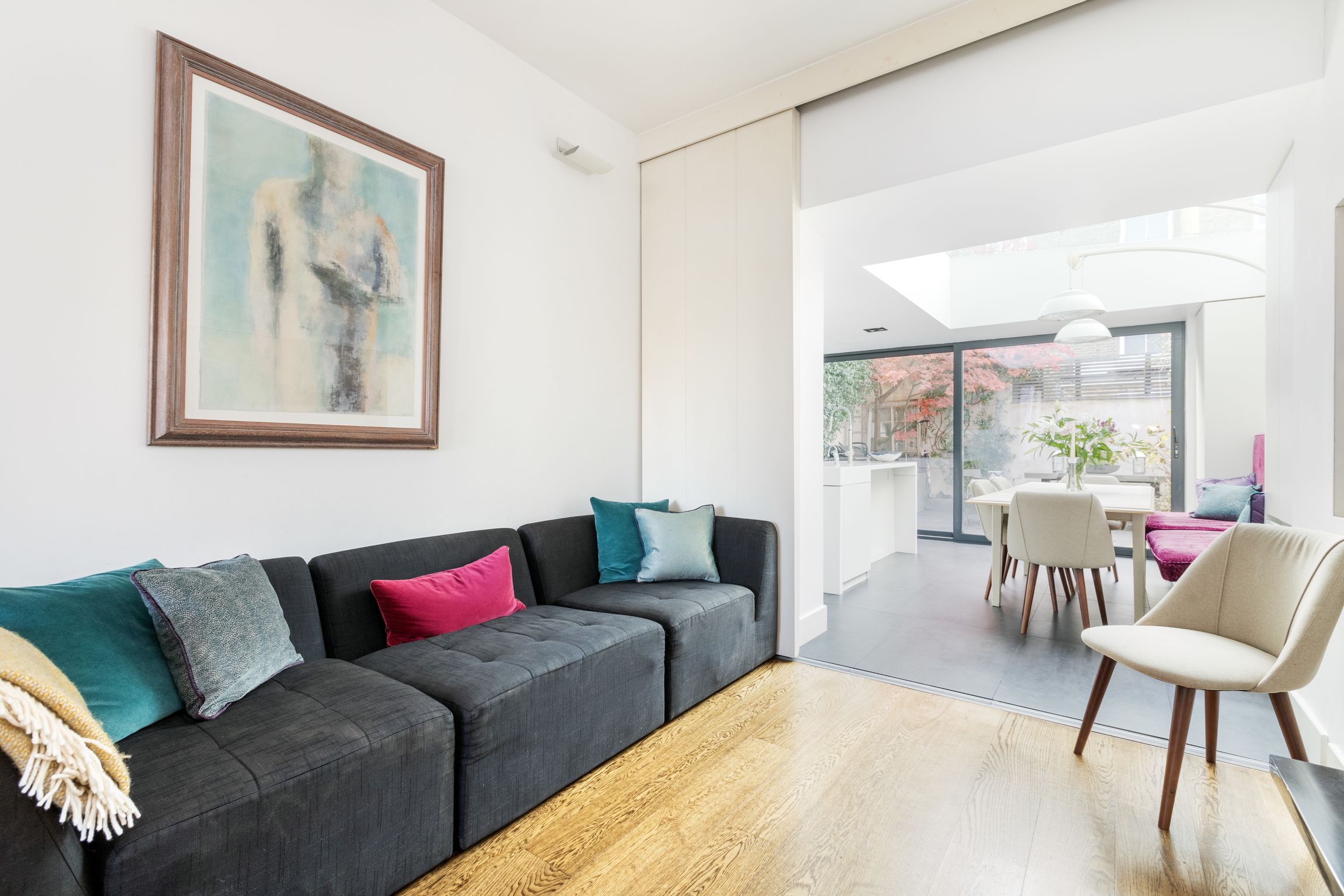The spacious double-length reception room with wood floors and windows front and back is ideal for entertaining. There are two comfortable sofas, a piano, and a large digital TV with a good selection of sky channels.