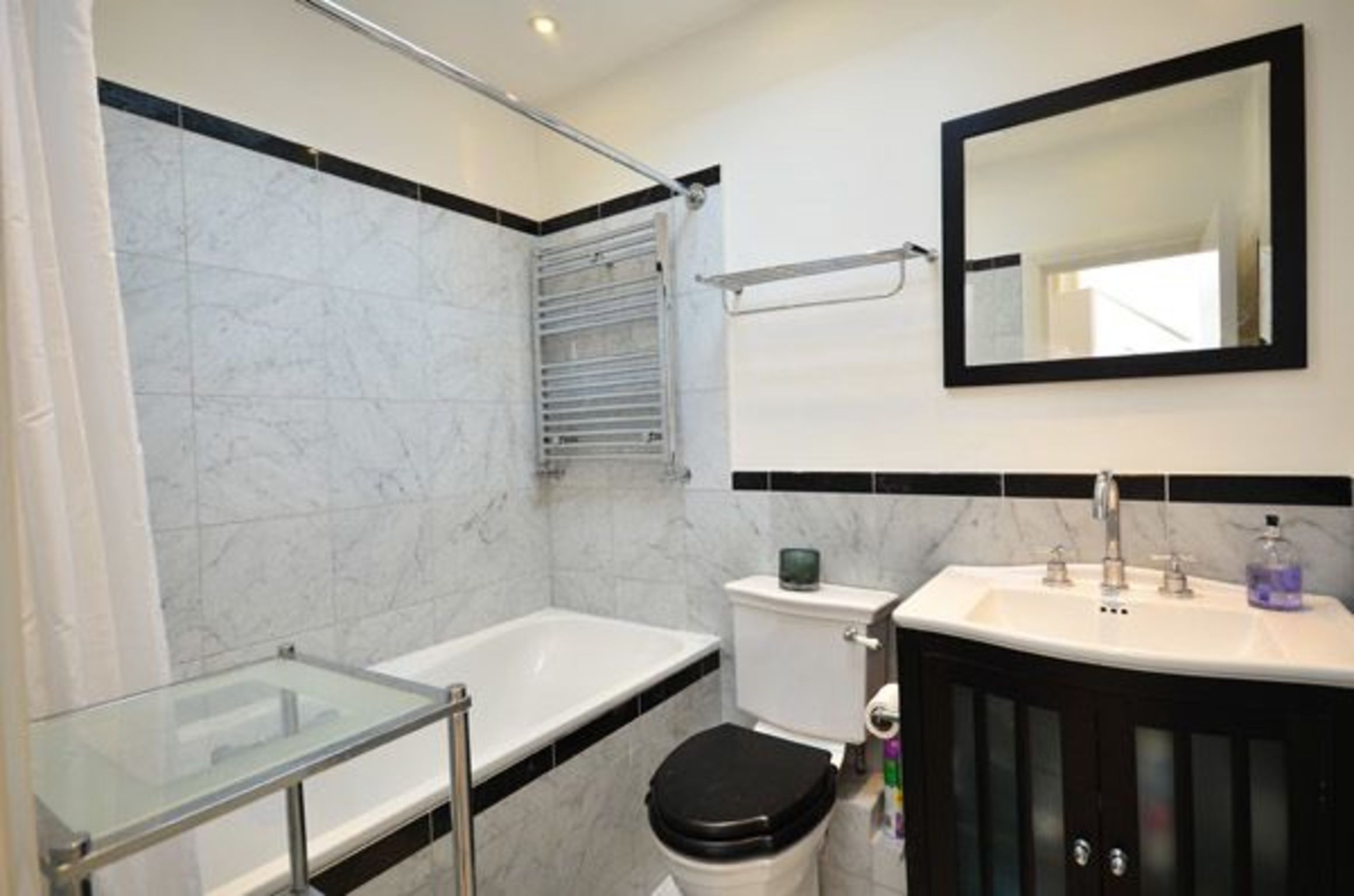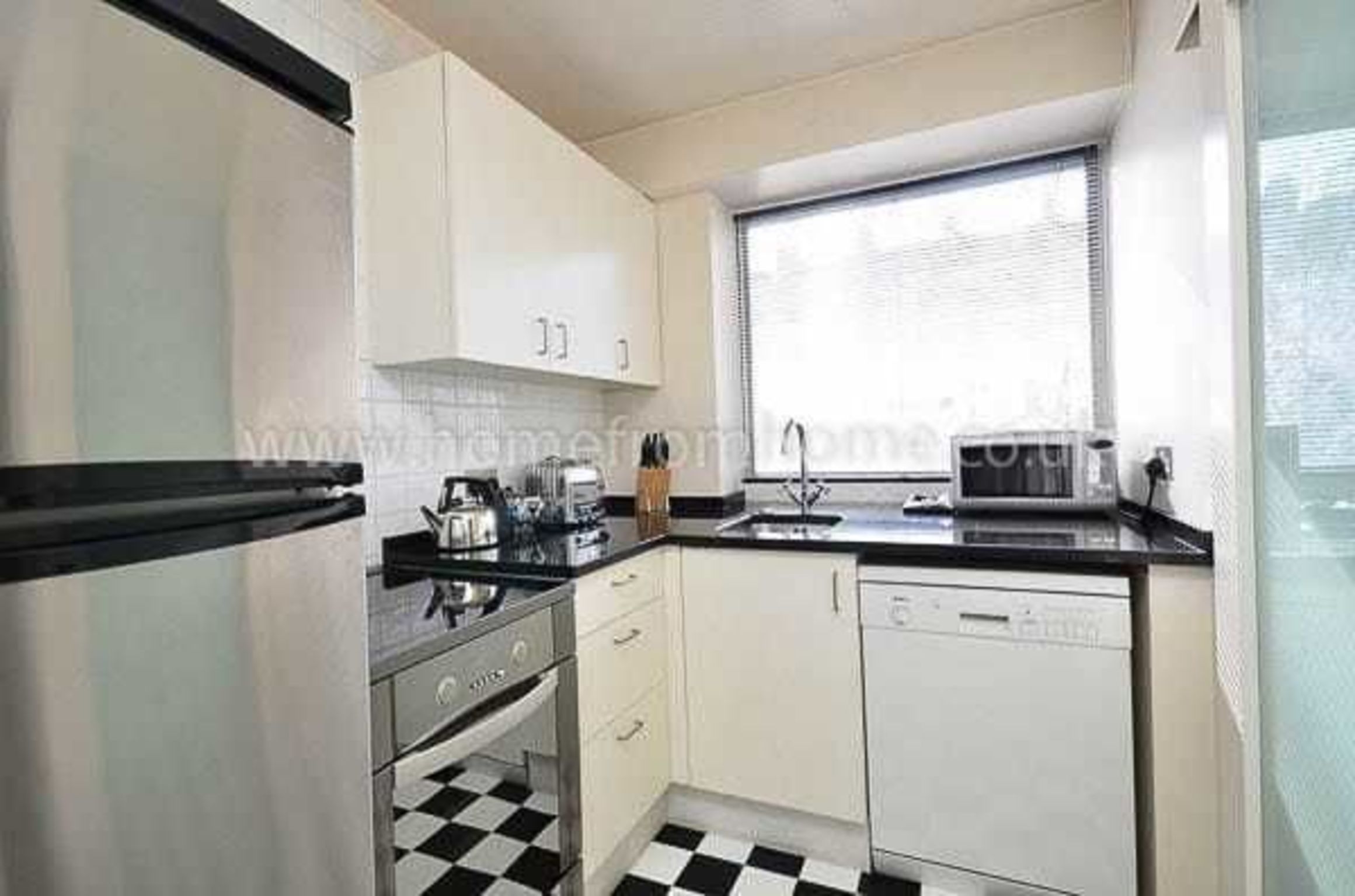 The black and white theme continues in the kitchen, small but well organised with top brand appliances: electric stove, microwave, a good sized fridge/freezer and dishwasher, plus a washing machine and dryer.