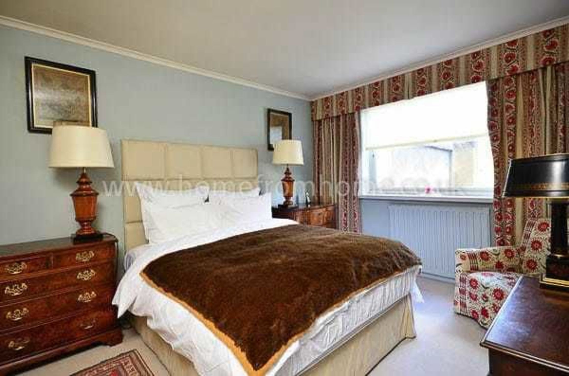 A relaxing and quiet room at the back of the building with a king size bed and the period charm of antique furniture and fabrics, plus the convenience of good cupboard space.